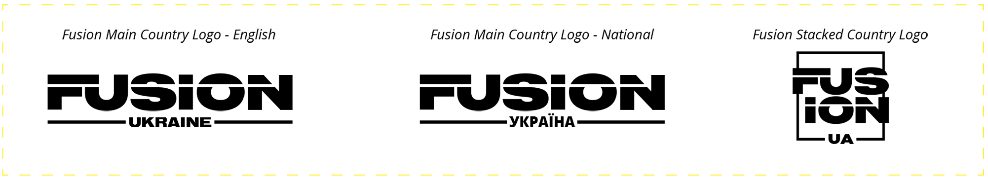 Fusion branding is also used in the country level of ministry. For countries that are leading several local Fusions, there are country-specific logos (“Fusion [country]”). There are three variations of these logos: country logo in English, country logo in the national language, and country logo with the country code.
